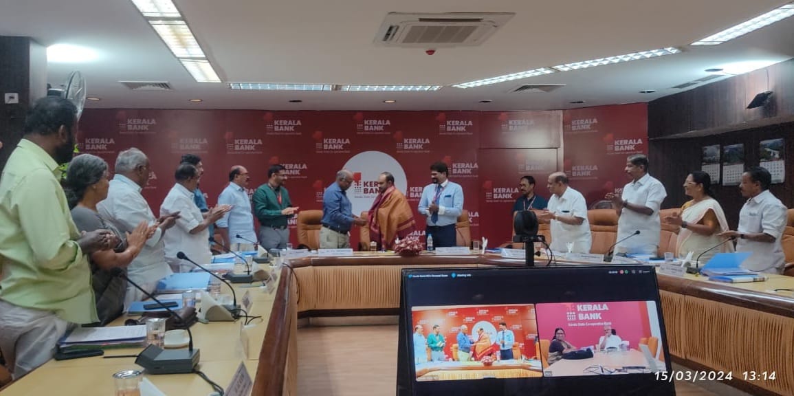The first CEO of Kerala Bank, Sri. P.S. Rajan, who had led the Bank through its tumultuous formative years, was given a warm and emotional farewell at the Bank head office in Thiruvananthapuram on 15.02.2024. The function saw Bank director, Sri.Rameshbabu, current CEO Sri. Jorty M.Chacko, Executive Director, Sri.K.C Sahadevan, CGM, Sri.Roy Abraham, GMs and other employees at Head Office gathering to harp on the yeoman service the former CEO had done in handholding the nascent Bank throughout his fruitful four years.Sri.Rajan thanked the team Kerala Bank for executing his vision for the Bank during his tenure. Earlier in the day, the Bank Board and Board of Management held a joint sitting to bid farewell to Sri.P.S.Rajan.